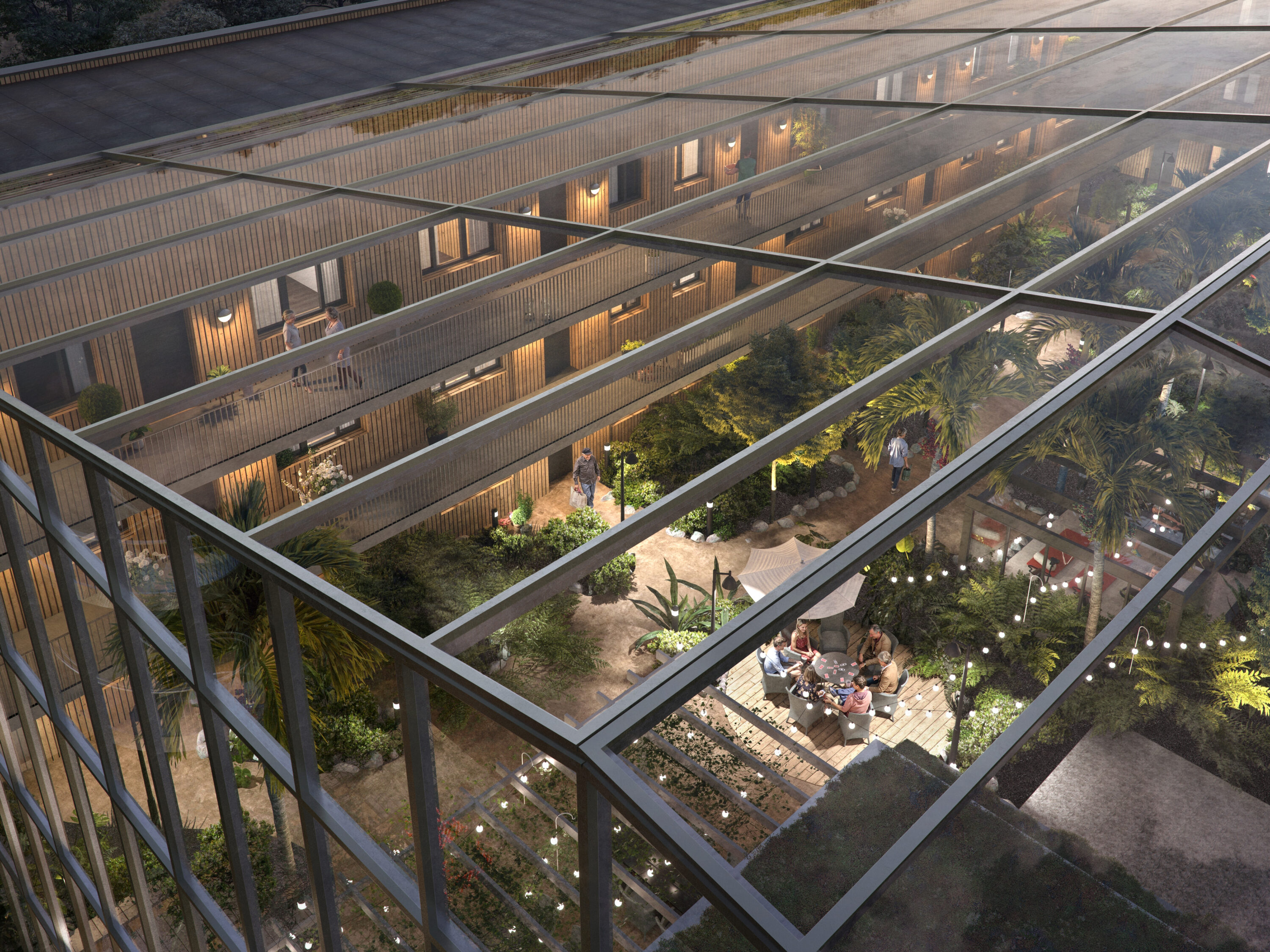Den spektakulære vinterhagen – Bovierans grønne hjerte – binder boligene sammen og gir beboerne et frodig, temperert uterom året rundt. Her kan man nyte kaffe, pleie planter eller slå av en prat, uansett vær og årstid.