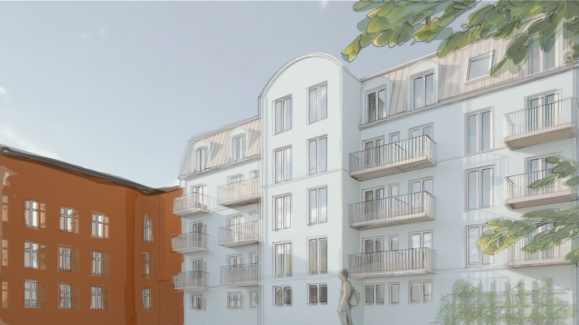 Bygget får en klassisk murpusset fasade som harmonerer med områdets historiske sjarm, samtidig som prosjektet har gode innvendige kvaliteter. De store vindusflatene slipper inn rikelig med naturlig lys og skaper en sømløs forbindelse til bylivet.