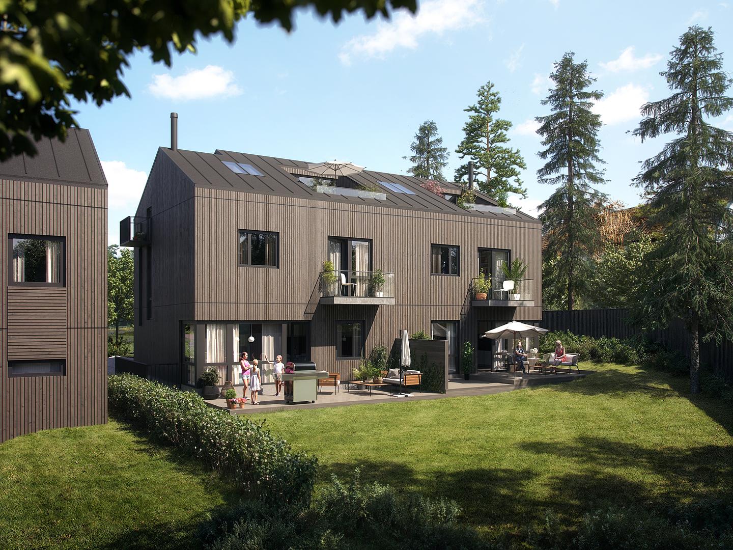 Hver bolig har en privat hage med skjermet beliggenhet, ideell for sosiale sammenkomster og avslapping på solrike dager. I tillegg har hver bolig en takterrasse, perfekt for å nyte utsynet til de vakre omgivelsene.