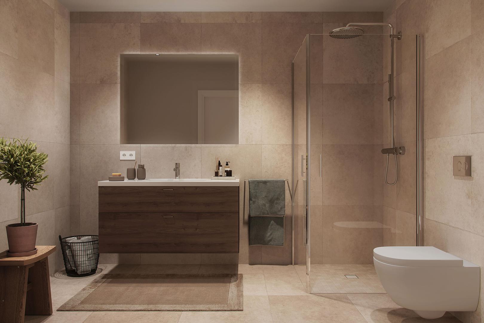 Baderommet viderefører de samme kvalitetene, teksturene og fargevalgene du finner ellers i boligen – et rom dedikert til velvære.